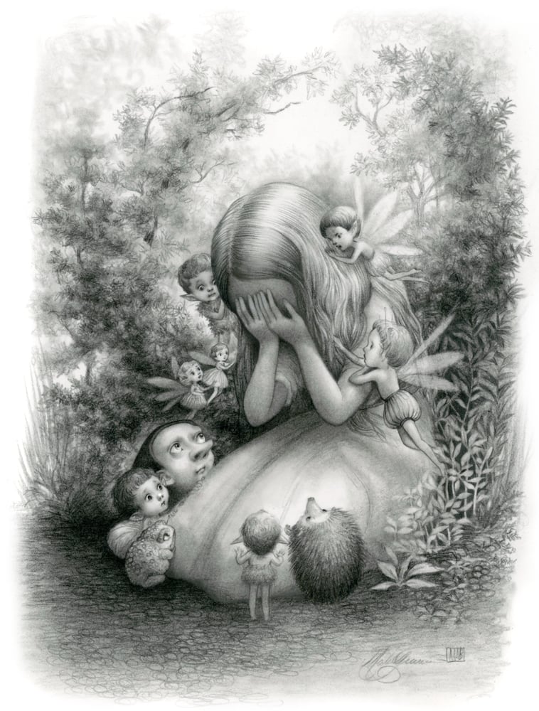 Title: Lirien Mourns Artist: Mab Graves Medium: Graphite on Stonehenge paper Size: 6”x 8” Framed Size: 15”x 17”
